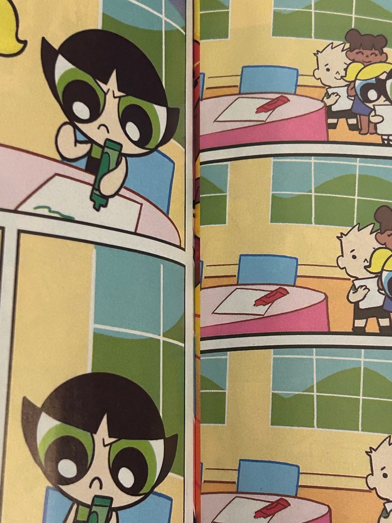 And there are a few pages in the book where the art isn’t aligned properly so you can see a different page down the middle: